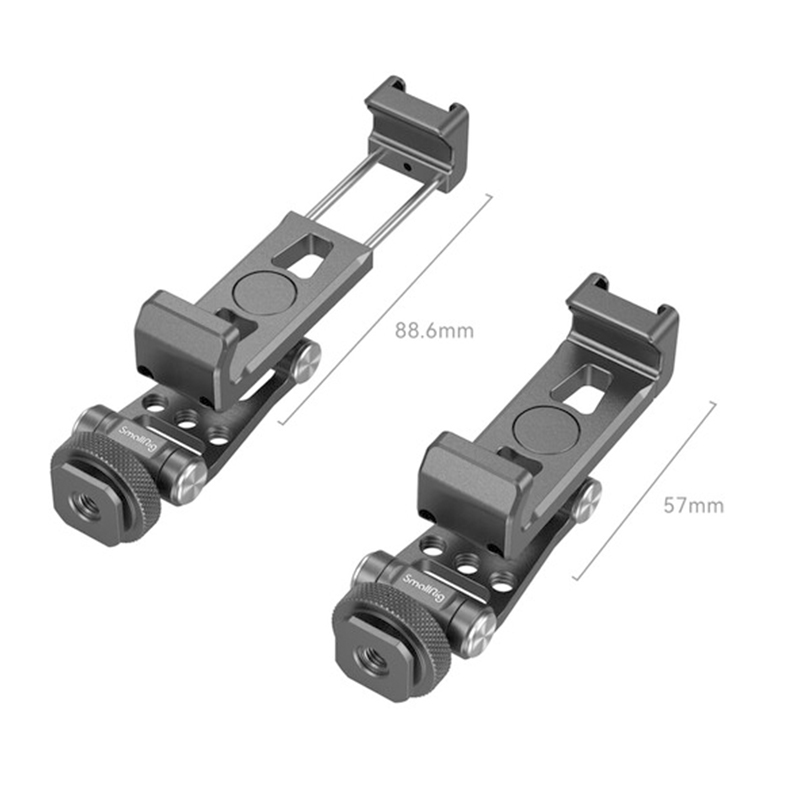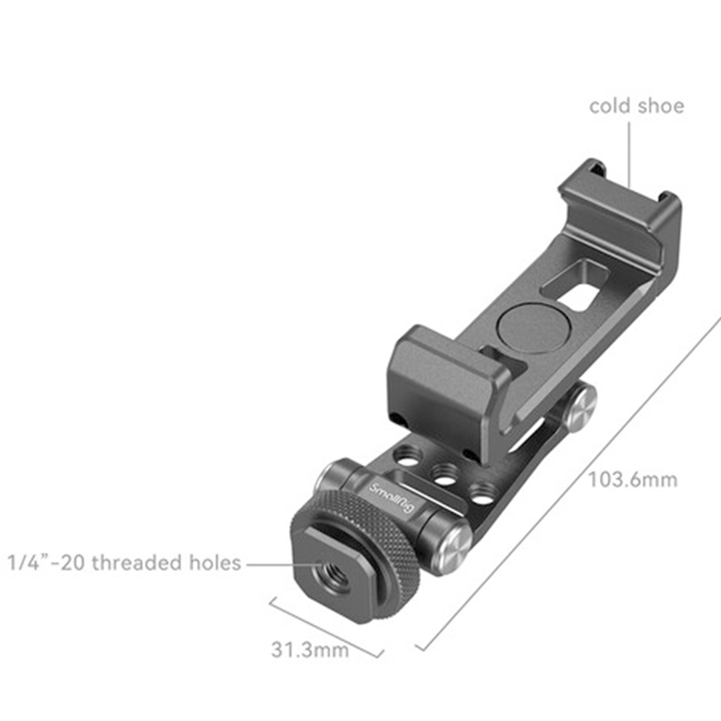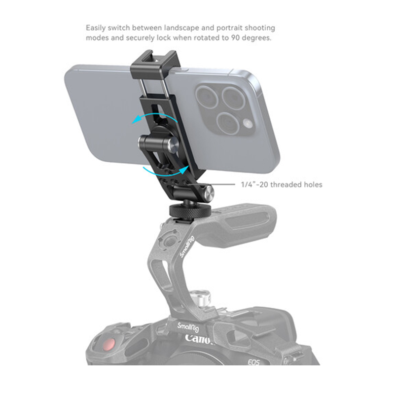 La abrazadera con resorte se adapta a teléfonos de 2.5″ a 3.5″ de ancho, con almohadillas internas que protegen el dispositivo. La base combina una rosca 1/4″-20 y una zapata fría, lo que permite montarlo directamente sobre cámaras, cages, trípodes o brazos articulados.